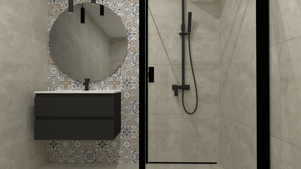 Łazienka Stone & Patchwork to ożywiony wzorem styl loftowy, ubrany w czarną armaturę, okucia szyby i szafki.