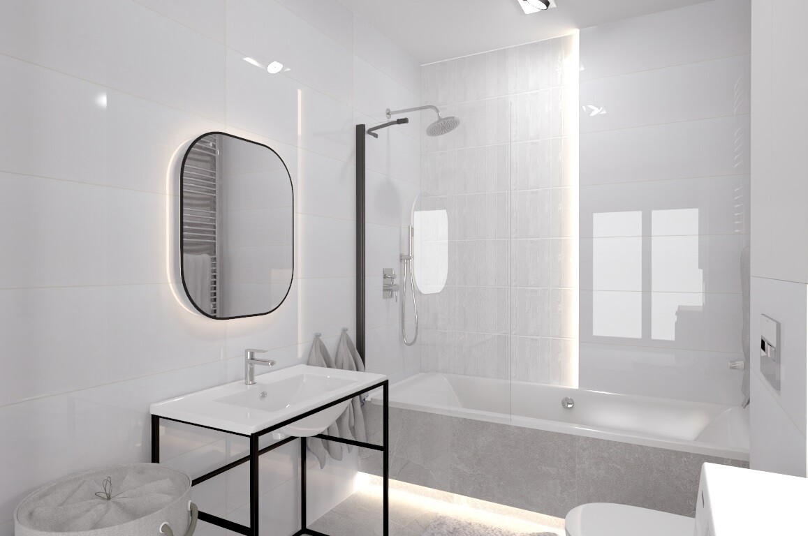 Łazienka Winter 01 to rozjaśniony bielą styl nowoczesny, ocieplony ciepłym dekoracyjnym światłem LED.